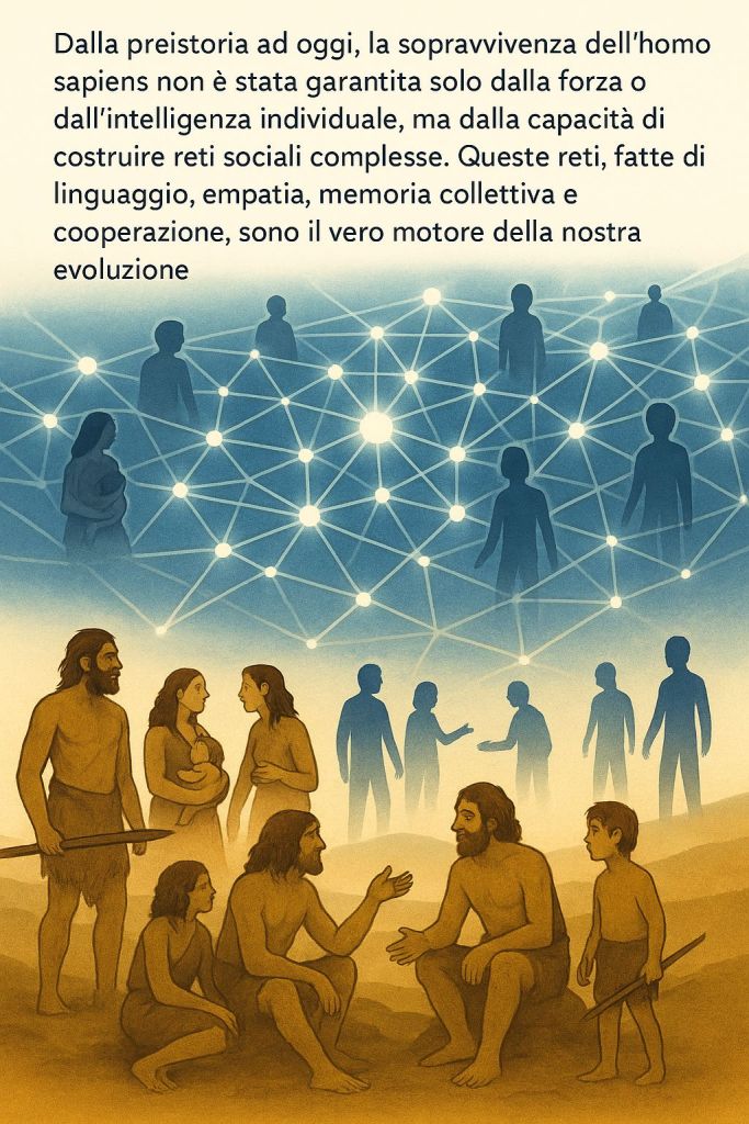 Dalla preistoria ad oggi, la sopravvivenza dell’homo sapiens non è stata garantita solo dalla forza o dall’intelligenza individuale, ma dalla capacità di costruire reti sociali complesse. Queste reti, fatte di linguaggio, empatia, memoria collettiva e cooperazione, sono il vero motore della nostra evoluzione. Oggi, però, queste stesse reti – digitali, sociali, culturali – vengono utilizzate non solo per informare, ma per orientare, controllare e rassicurare. Le reti sono diventate lo strumento preferito per costruire narrazioni collettive, che spesso rimpiazzano il pensiero critico con ideologie emozionali e semplicistiche ma le reti sono anche state la spinta, il seme, dello sviluppo dell’intelligenza sociale con il suo corrispondente neocorticale.
