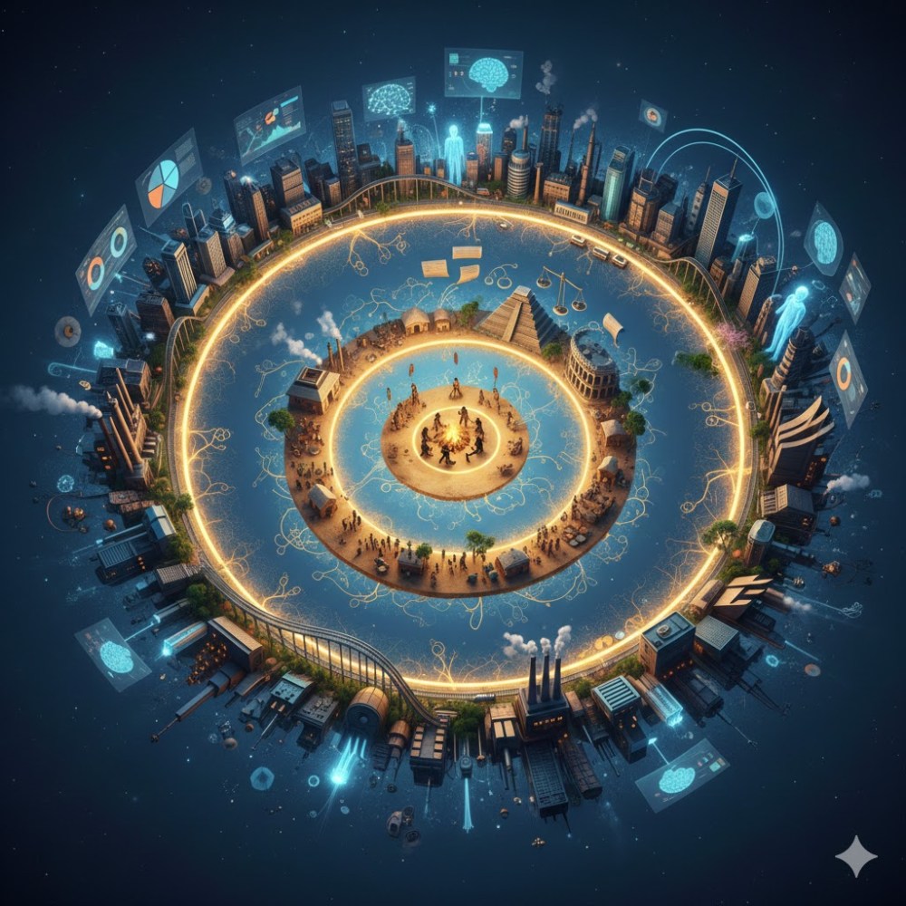 L’analisi storica di Nexus comincia con l’Età della Pietra, un periodo in cui le reti umane erano intrinsecamente limitate. In queste comunità di cacciatori-raccoglitori, le reti erano piccole, basate su legami diretti tra gli individui. L’informazione era prevalentemente orale, locale e facilmente verificabile attraverso l’esperienza diretta. Questa struttura limitava la capacità di sostenere complessi miti coercitivi su vasta scala, mantenendo una forma di verità più vicina alla realtà empirica immediata.